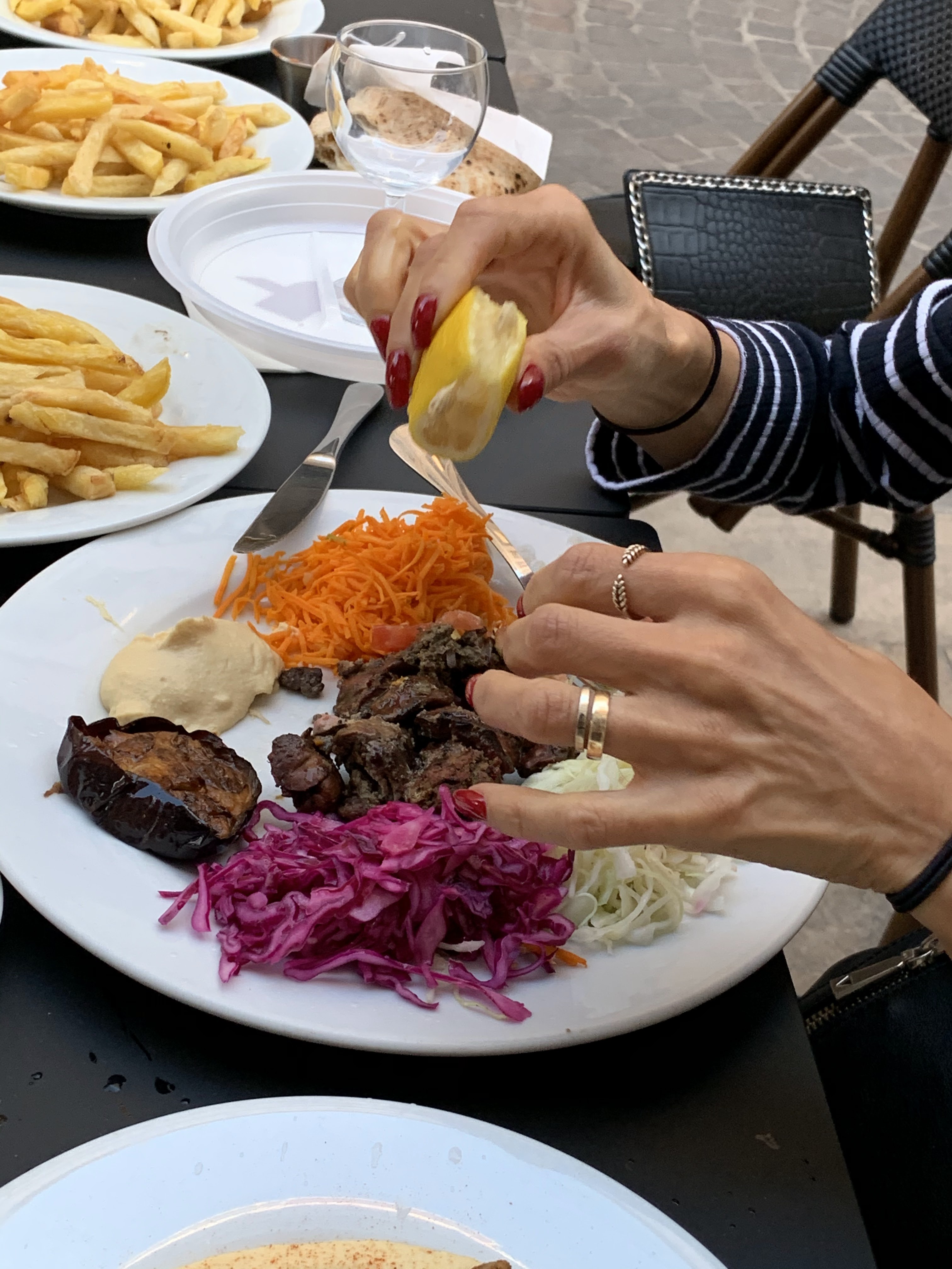 Il paraît que c'est un des meilleurs falafel du coin. Donc décidément, il faut aller les manger au Marais chez Anna. Je trouve qu'il manquait vraiment la petite touche, la menthe dans le chou, les petits plus qui font que c'est comme à Paris (la tour Eiffel, peut être ??😋). Par contre la viande est préparée, marinée par leurs soins et on voit la différence et la serveuse est très sympathique. Bon app.